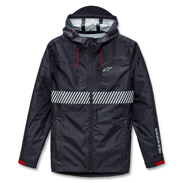 Hard-shell rain jacket with water-resistant 2.5L fabric and taped seams Fixed hood, pre-curved arms, coated reverse coil front zipper, zipper hand pockets Side zipper vents, Bungie adjusters at hood and hem, Velcro adjuster tabs at cuffs Internal main label and external label branding. Reflective detail. Logo at chest