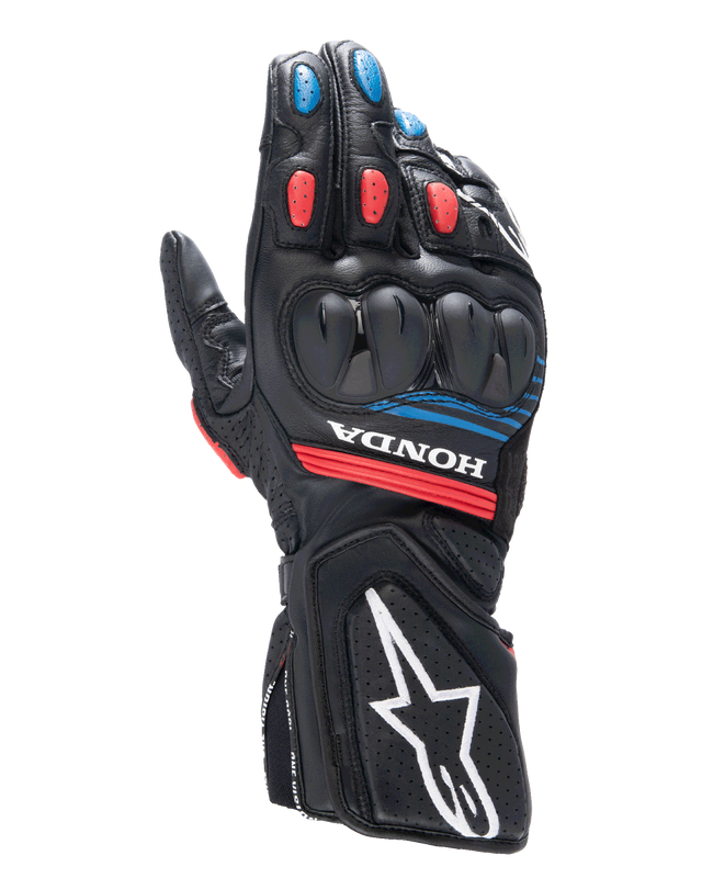 A universal riding glove packed with racing DNA for maximum performance, the Honda SP-8 V3 Leather Gloves are constructed from highly abrasion resistant, full grain goat leather and synthetic leather material. Thanks to their advanced MotoGP-derived SP dual density knuckle protection, the SP-8 v3s deliver high levels of protection. With a pre-shaped finger construction, a hook and loop cuff closure, and a new anatomically profiled grip insert on the palm and thumb, the Honda SP-8 V3 Gloves offer a secure and highly personalized performance riding fit and high levels of movement and comfort to sports riders.