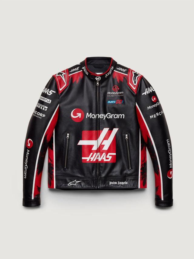 The boldness of motorsports, the unique aesthetic made of performance materials and the decorative overload of lettering and graphics, the sense of exclusivity associated with racing events. Palm angels + Alpinestars x Moneygram haas f1 team jacket sums it all up, adding a touch of california vibes: the palm tree motif in red, the same as the paddock club and garage décor along the pit lanes, makes this garment a statement in the pits.Black leather jacket with front zipper, collar and cuffs with zipper and buttons, palm angels logo on the collar and front, alpinestars logo and emblem in different positions on the front, back and sleeves, Moneygram haas logo in different sizes and positions. Palm angels signature detail: of red palm trees on a black background under the sleeves and extended on the shoulders and hips.For motorsport thrill-seekers, this jacket can be pre-ordered starting may the 6th, on the occasion of the Miami grand prix.Each individual piece is made to order only. Delivery will follow orders and will take place from 40 to 60 days from the end of may (depending on the geographic delivery area) as the pre-order lasts for 30 days.Feel free to contact our dedicated customer service for any further questions and details.